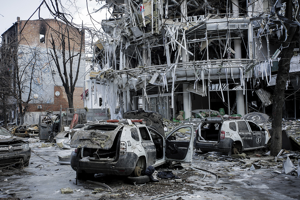 Damaged vehicles among debris and in Kharkiv city center in Ukraine, March 16, 2022. /CFP