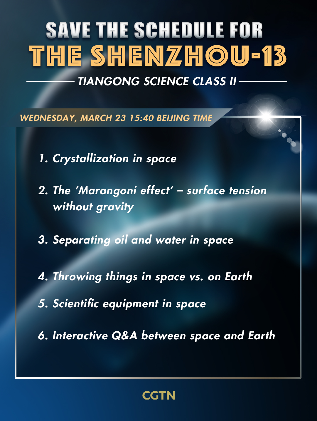 Taikonauts aboard China's space station will hold the second episode of Tiangong Class on March 23, the China Manned Space Engineering Office (CMSEO) announced Friday.