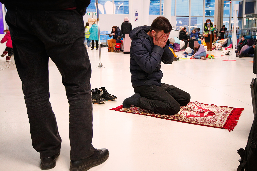 A Muslim man prays in the central train station in Warsaw, Poland, March 7, 2022. /VCG