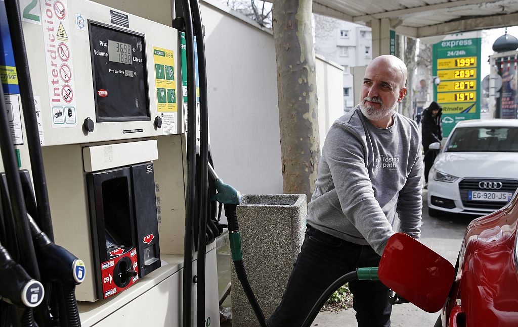 A driver refuels his car at a British Petroleum gas station in Paris, France, March 2, 2022. /VCG