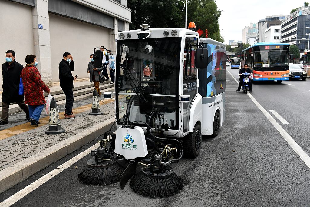 An intelligent unmanned road sweeper on a street in Fuzhou city, east China's Fujian Province. /CFP