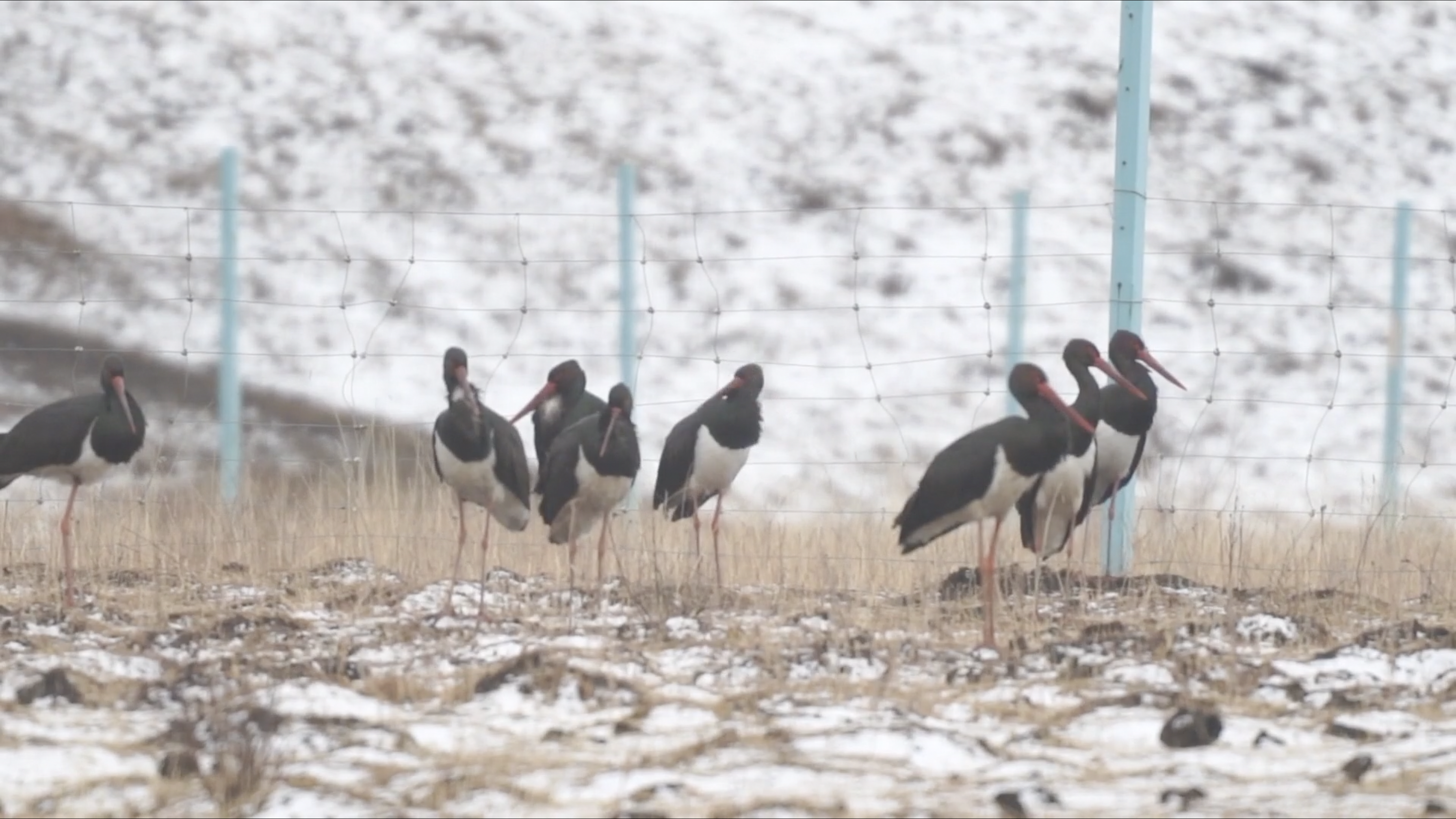 Migratory birds gather for food in Qiongxi Wetland Park in Hongyuan County after a spring snow. It's at the southeastern edge of the Qinghai-Tibet Plateau. Among the birds, the endangered black stork is under China's highest level of national protection. Black storks are an important environmental indicator because they live only in environments where the water quality is good. The black stork has been seen in Hongyuan County for many years, indicating an improved environment.