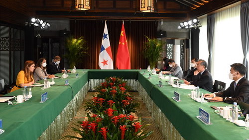 Chinese State Councilor and Foreign Minister Wang Yi and Panamanian Foreign Minister Erika Mouynes met on Monday in Tunxi, east China's Anhui Province. Wang said bilateral ties have entered a new chapter since China and Panama established diplomatic relations. Mouynes said Panama adheres to the one-China principle as the political foundation of bilateral ties. During her meeting with Wang Yi, she pledged to welcome Chinese investors in Panama.