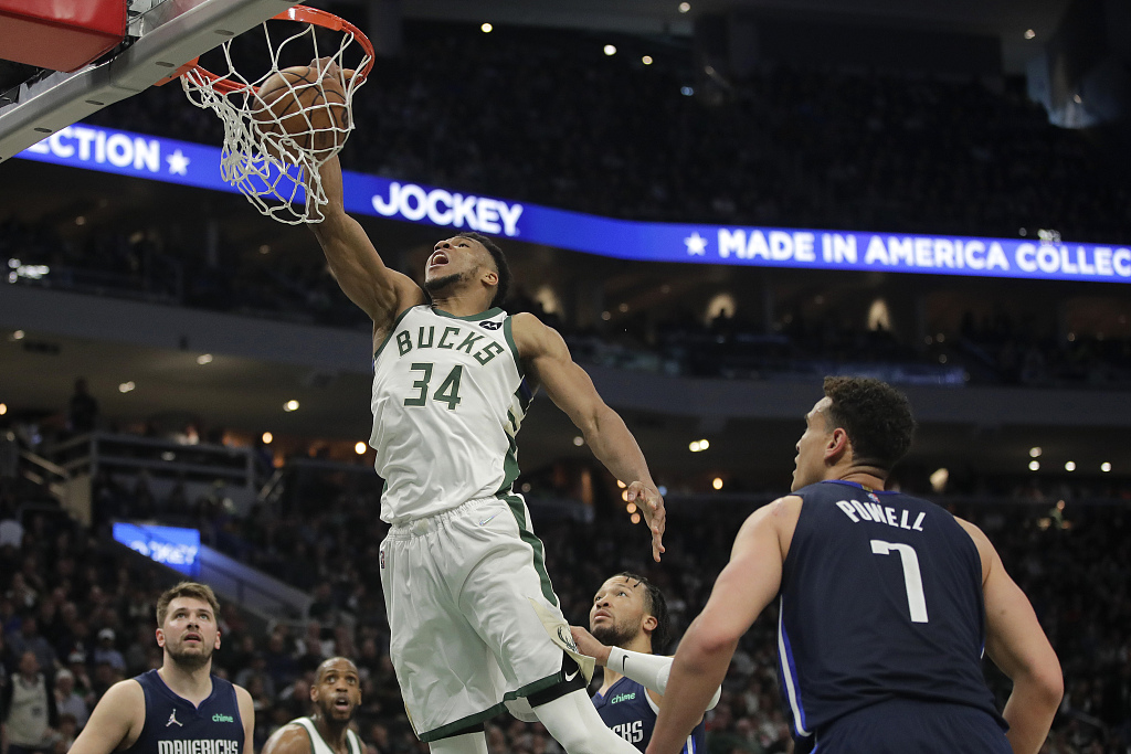 Giannis Antetokounmpo (#34) of the Milwaukee Bucks dunks in the game against the Dallas Mavericks at Fiserv Forum in Milwaukee, Wisconsin, U.S., April 3, 2022. /CFP