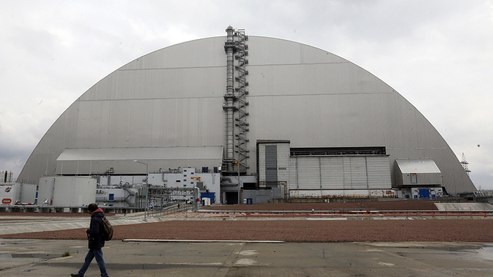 A cone sheltering the explosion-damaged reactor unit of the Chernobyl nuclear plant in Chernobyl, northern Ukraine, April 15, 2021. /CFP