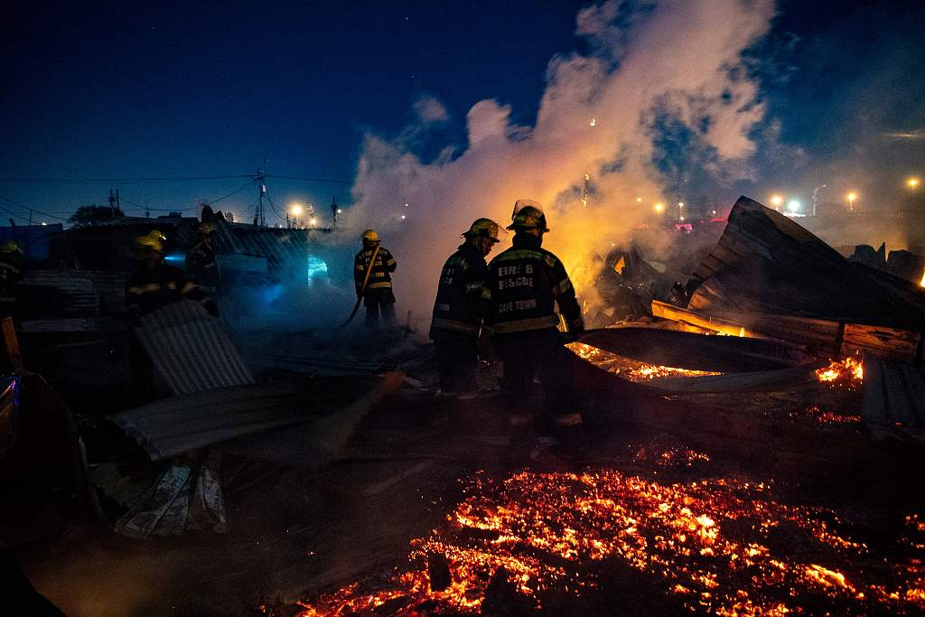 Members of the City of Cape Town Fire and Rescue Services extinguish a fire after it broke out in Langa, Cape Town, South Africa, April 16, 2022. /CFP