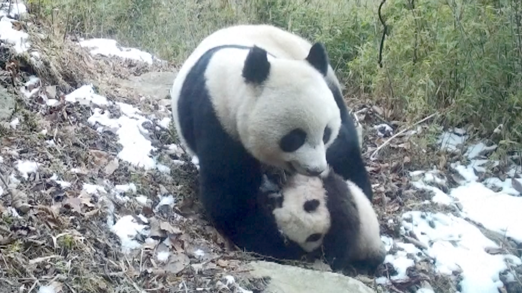 Photos of a giant mother panda holding her baby in her mouth were captured in China's Giant Panda National Park last December. This baby panda was just born and looked like it was sleeping and apparently couldn't walk. The same mother and baby panda were spotted again this March, with the baby starting to learn to crawl and the mother showing great patience in her "education."