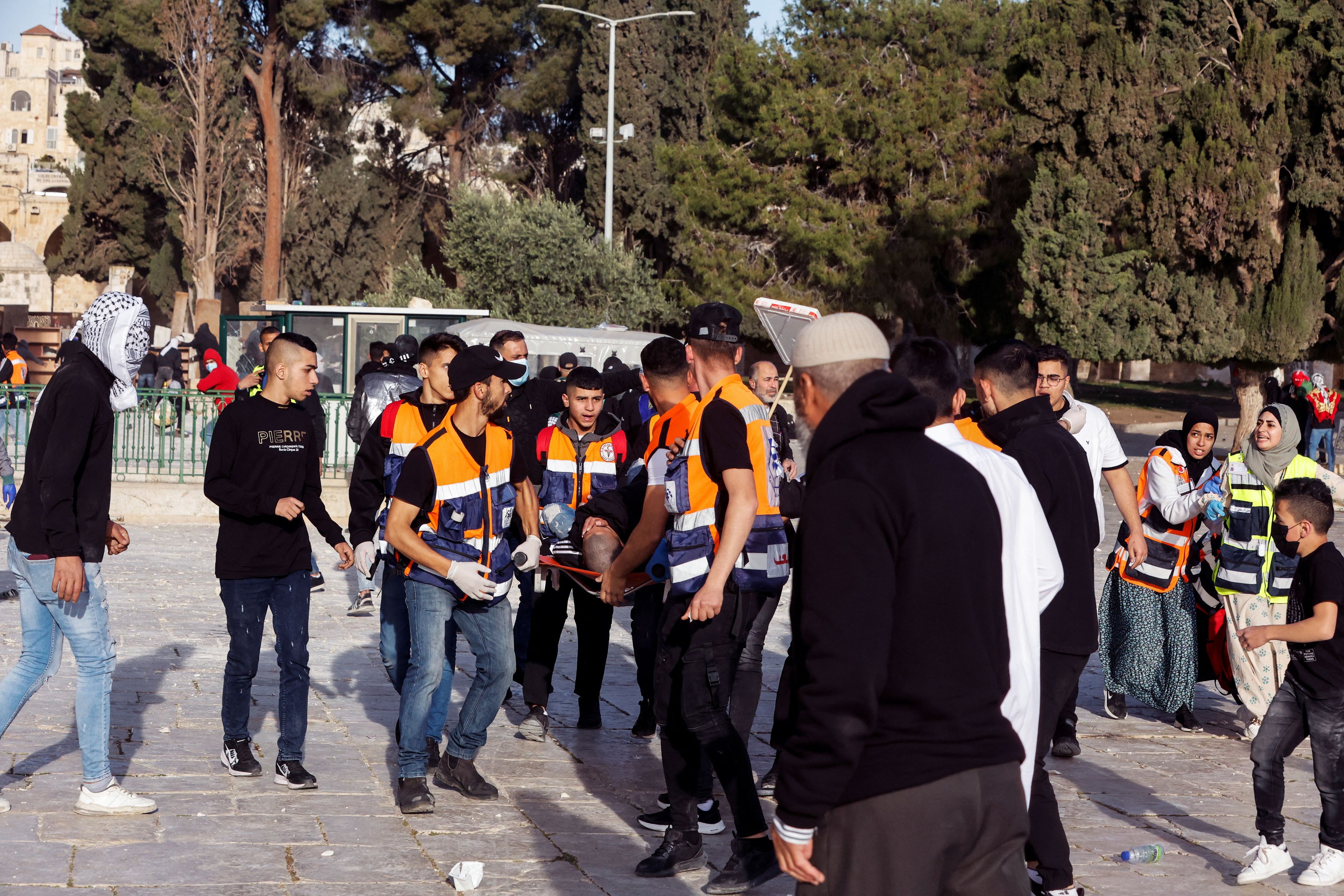 Palestinian rescue workers attend to an injured man during clashes with Israeli security forces at the compound that houses Al-Aqsa Mosque in Jerusalem's Old City, April 22, 2022. /Reuters