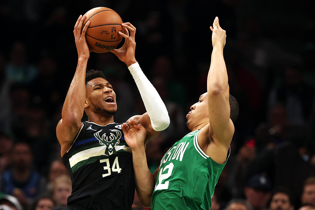 Grant Williams (R) of the Boston Celtics defends Giannis Antetokounmpo of the Milwaukee Bucks in Game 2 of the NBA Eastern Conference semifinals at TD Garden in Boston, Massachusetts, May 3, 2022. /CFP