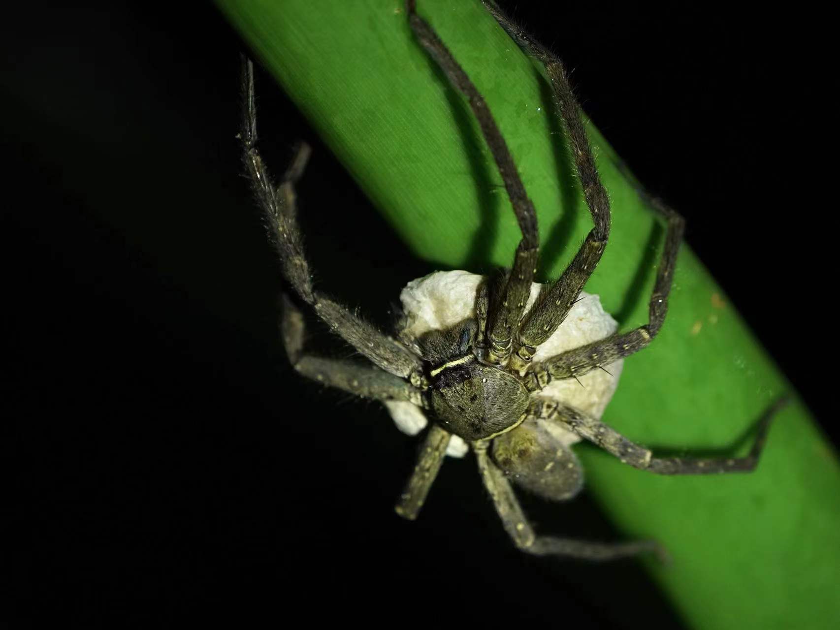 Heteropoda venatoria, a spider species, with a while egg sac.