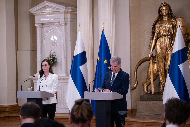 Finnish Prime Minister Sanna Marin (L) and President Sauli Niinisto address a press conference announcing Finland's decision to apply for NATO membership, at the Presidential Palace in Helsinki, Finland, May 15, 2022. /CFP