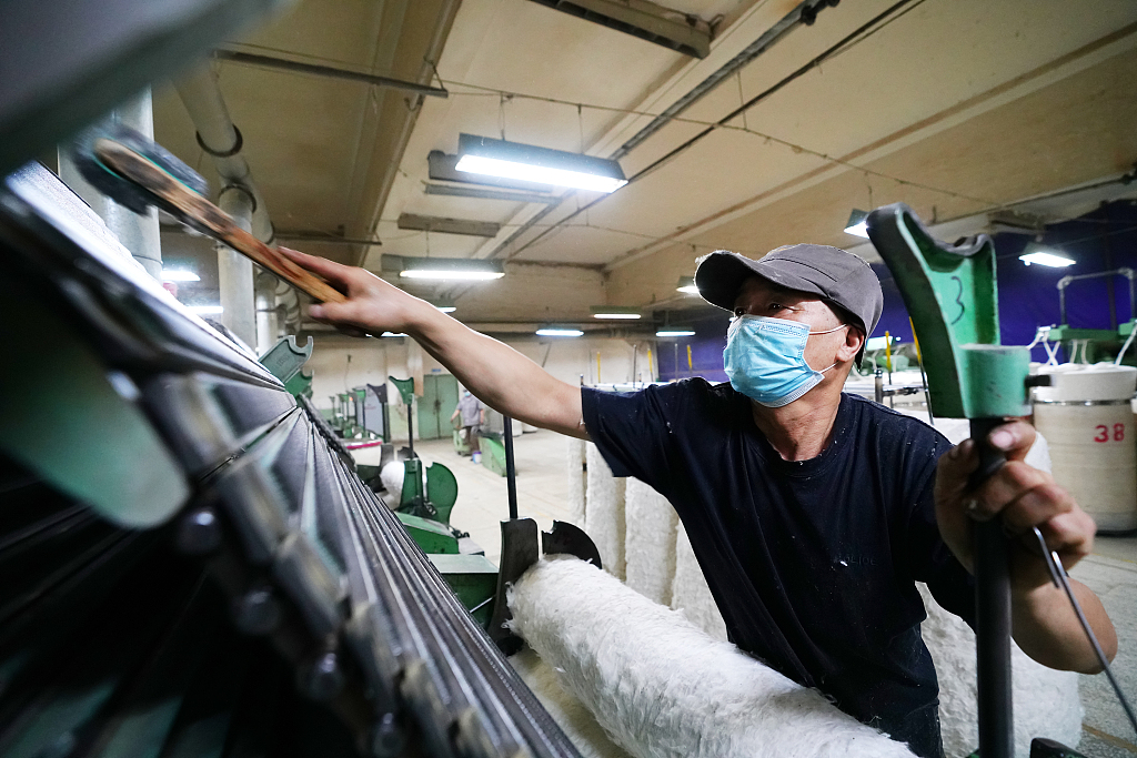 An employee maintains equipment at a cotton mill in Hami, Xinjiang Uygur Autonomous Region, China, March 14, 2022. /CFP