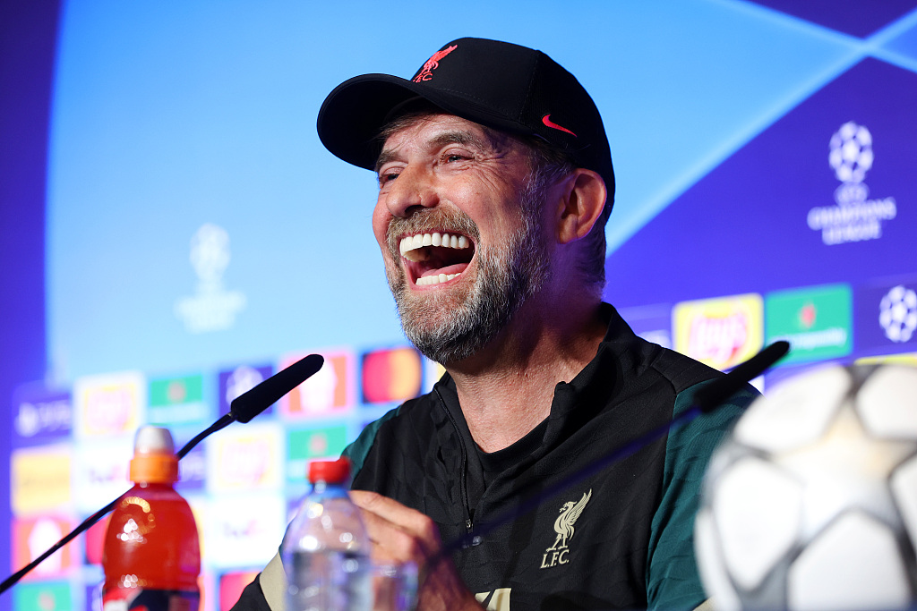 Juergen Klopp, manager of Liverpool, laughs during a press conference at Stade de France, Paris, France, May 27, 2022. /CFP