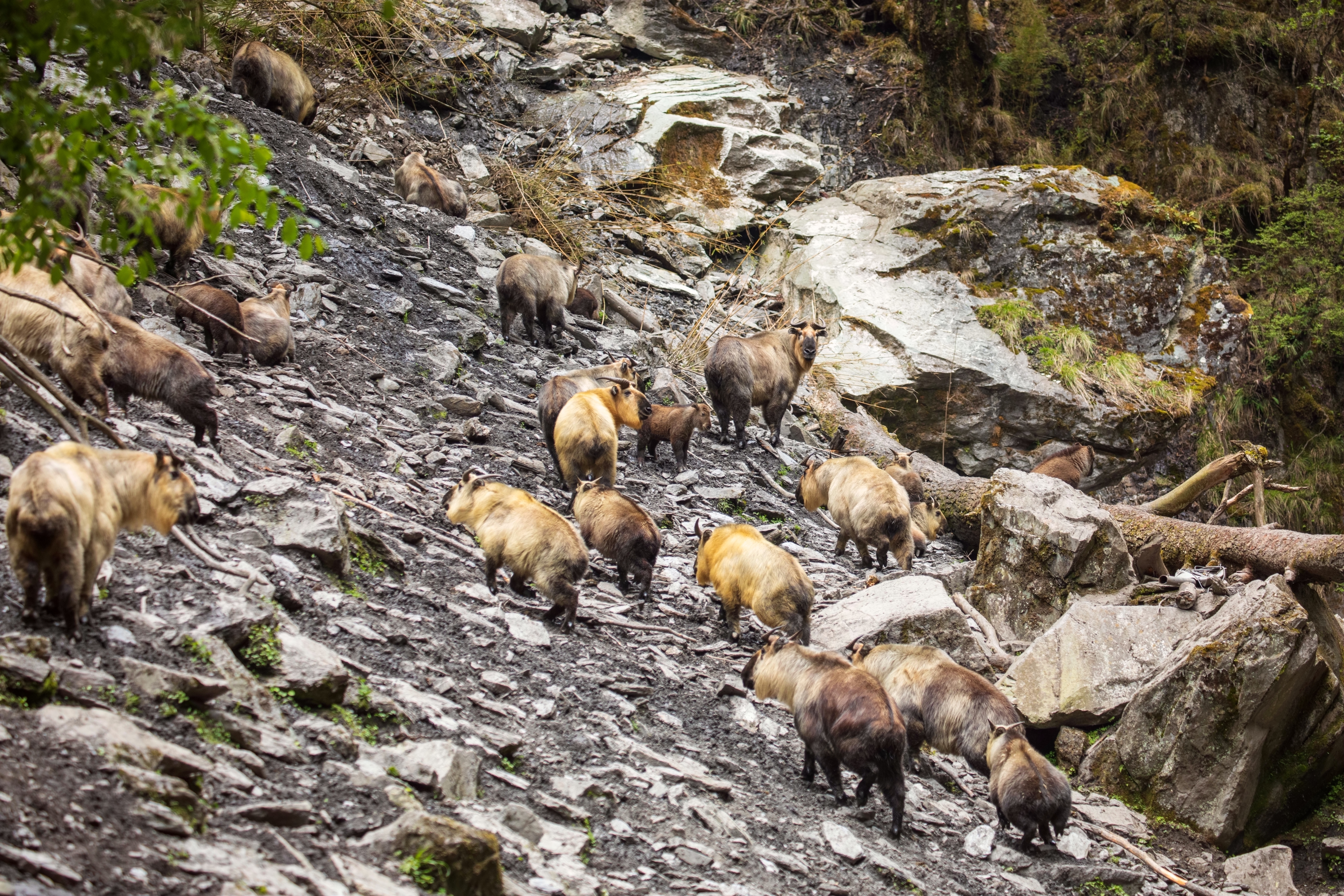 Thanks to its strong hooves, Sichuan takins can easily climb vertically on a steep cliff for food according to the season. They can also jump as high as two meters when they feel threatened.