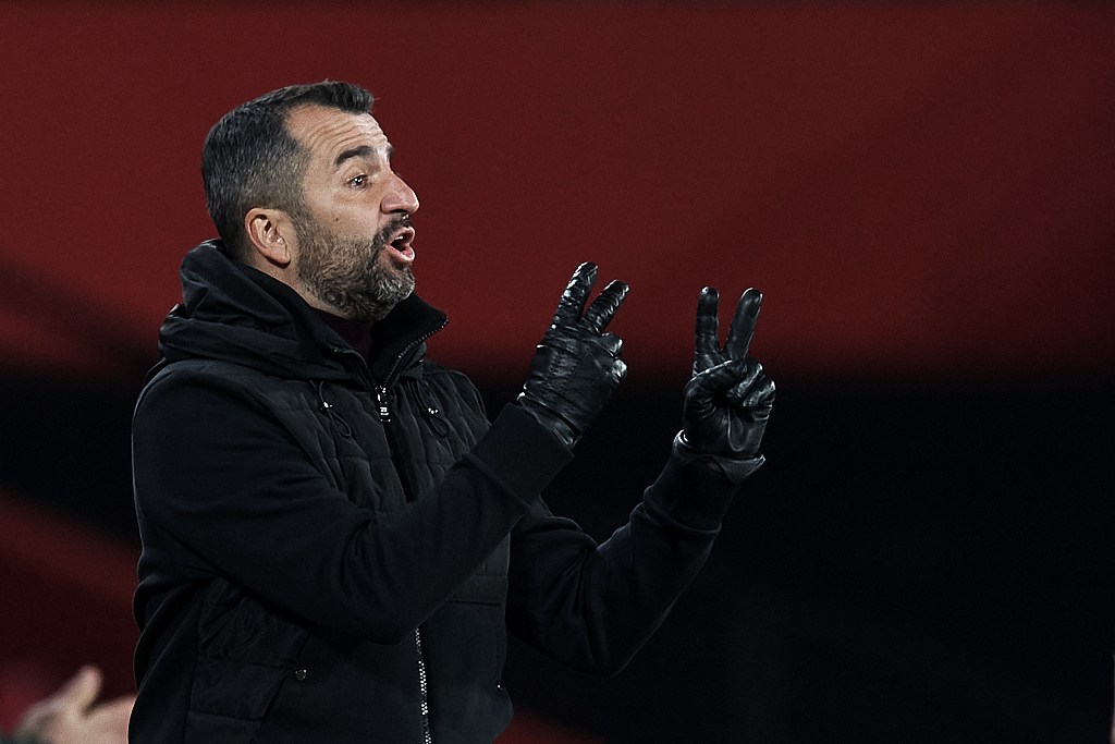Diego Martinez gives instructions during Granada's Europa League clash with Molde at Estadio Nuevo Los Carmenes in Granada, Spain, March 11, 2021. /CFP