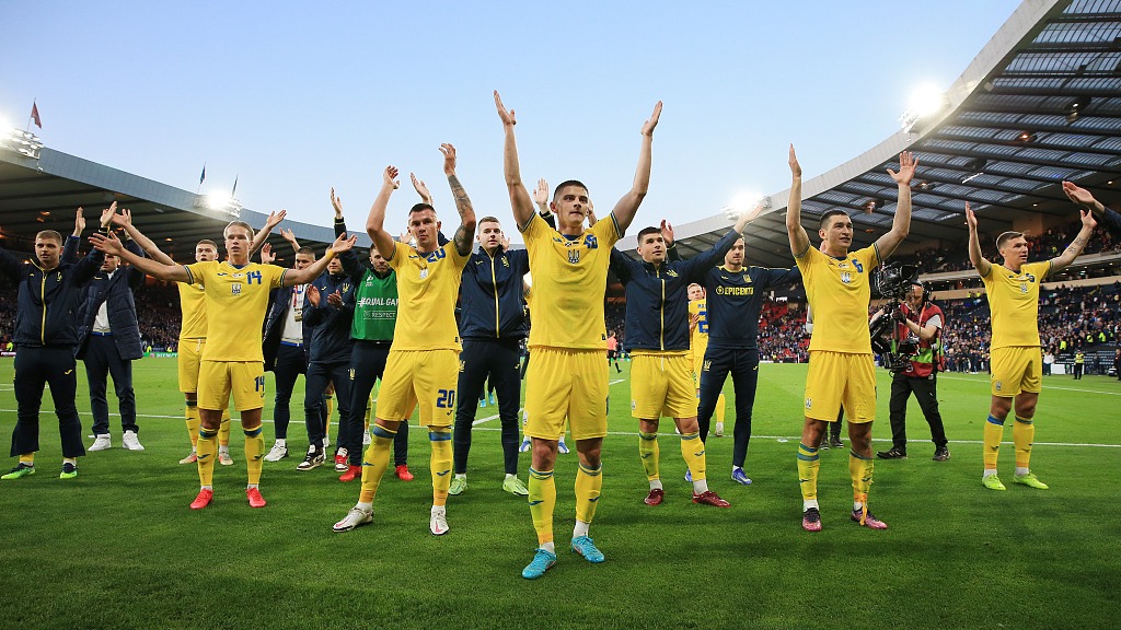 Ukraine players celebrate their victory over Scotland after the World Cup qualifier playoff semifinal at Hampden Park in Glasgow, Scotland, June 1, 2022. /CFP