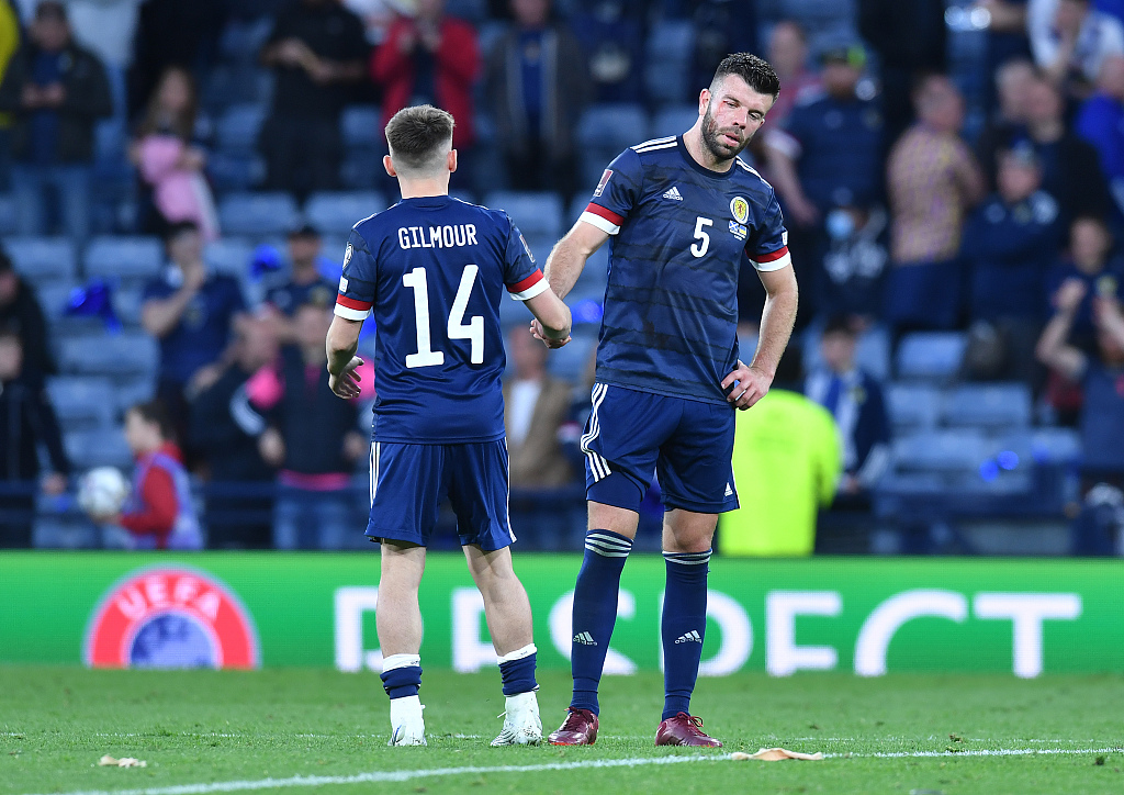 Billy Gilmour and Grant Hanley of Scotland reflect at the final whistle during the World Cup qualifier playoff semifinal at Hampden Park in Glasgow, Scotland, June 1, 2022. /CFP