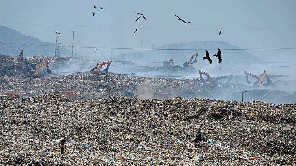 Workers operate excavators amid burning garbage after a fire broke out in Chennai City in southeast India, April 29, 2022. /VCG