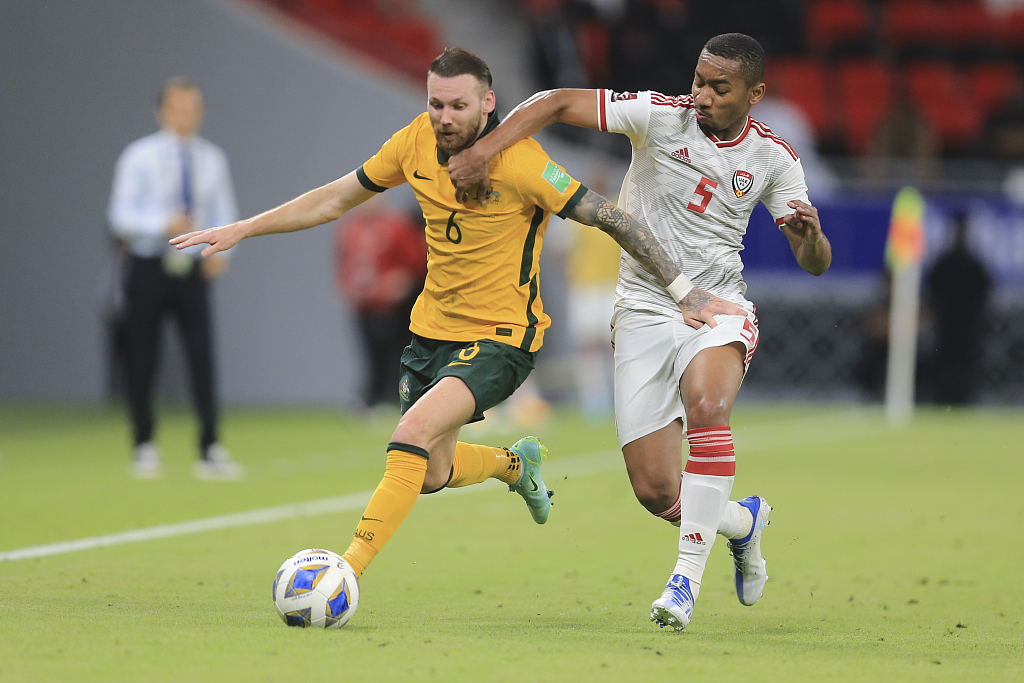 Australia's Martin Boyle (L) fights for the ball with Ali Hassan of the United Arab Emirates during their World Cup play-off clash with the UAE at Ahmad bin Ali stadium in Doha, Qatar, June 7, 2022. /CFP