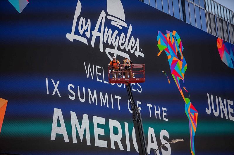 Workers fix an ad screen in front of the LA Convention Center during the Summit of the Americas in Los Angeles, California, U.S., June 6, 2022. /CFP