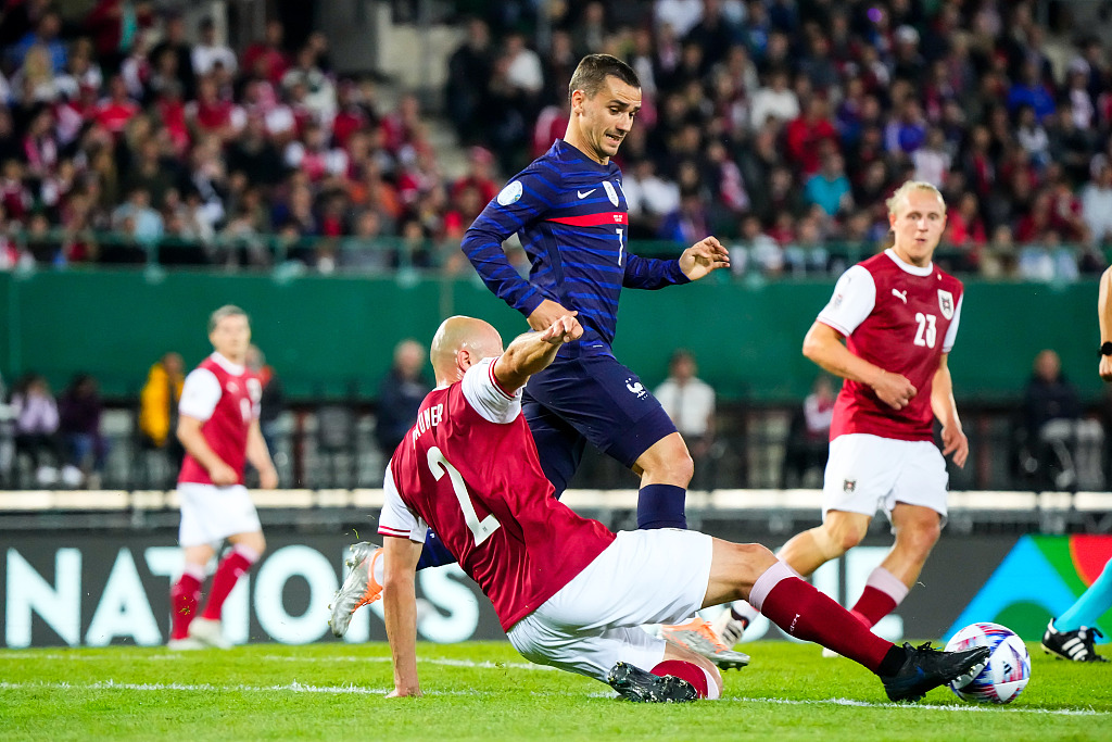 France's Antoine Griezmann (C) is tackled by Austria defender Gernot Trauner during their Nations League clash at the Ernst Happel stadium in Vienna, Austria, June 10, 2022. /CFP
