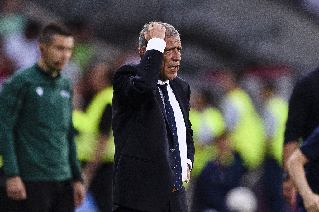 Portugal head coach Fernando Santos scratches his head after his team's first competitive away loss in nearly two years at State de Geneve, Switzerland, June 12, 2022. /CFP