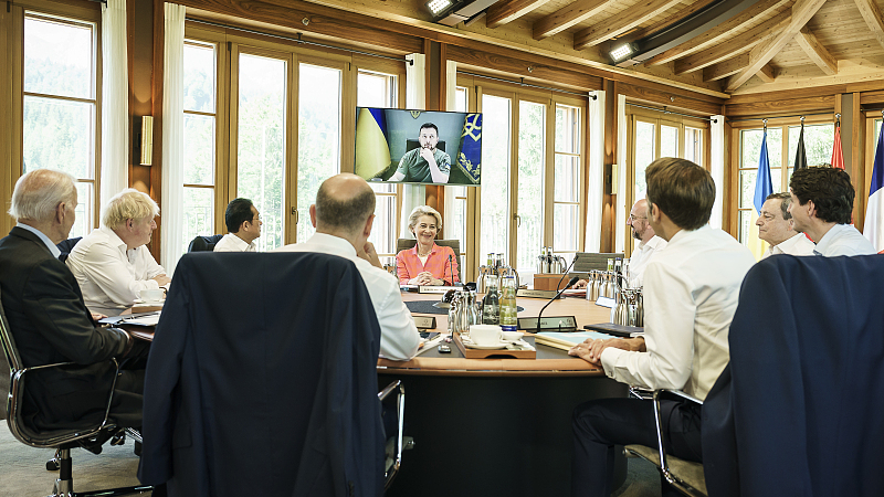 U.S. President Joe Biden, UK Prime Minister Boris Johnson, Prime Minister of Japan Fumio Kishida, European Union Commission President Ursula von der Leyen, European Union Council President Charles Michel, Prime Minister of Italy Mario Draghi, Prime Minister of Canada Justin Trudeau, President of France Emmanuel Macron and German Chancellor Olaf Scholz listen to Ukrainian President Volodymyr Zelenskyy on a video link during the G7 summit in Schloss Elmau in the Bavarian Alps, Germany, June 27, 2022. /CFP