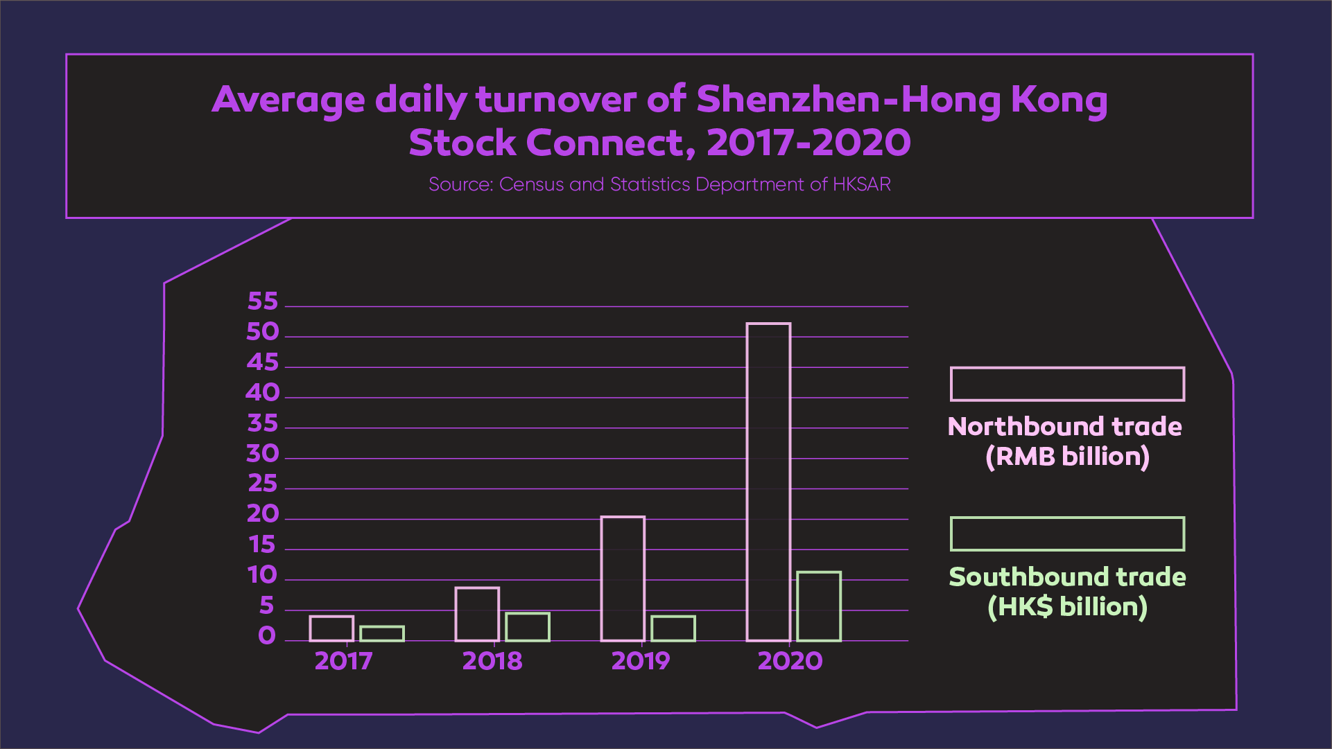 Statistics show that since the launch of the Shenzhen-Hong Kong Stock Connect at the end of 2016, the daily turnover of northbound trade, which is the capital flow from Hong Kong to Shenzhen, increased from 4 billion yuan (about $0.6 billion) in 2017 to 52.2 billion yuan (about $8.4 billion) in 2020, which was significantly higher than that of southbound trade over the same period.