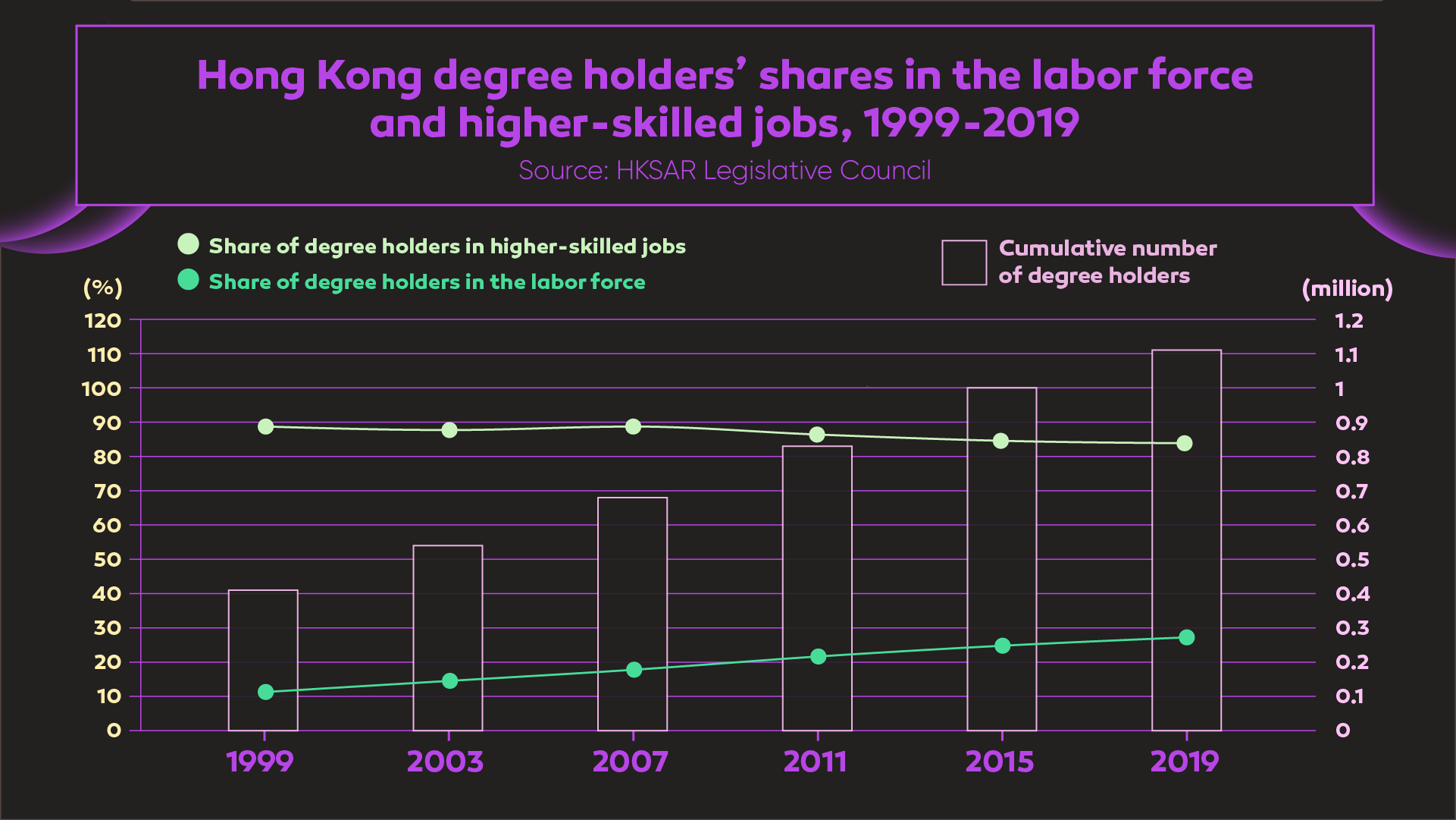 Statistics show that over the past two decades, with the continued expansion of tertiary education, the share of degree holders in Hong Kong's labor force rose rapidly from 12.3 percent in 1999 to 28 percent in 2019.