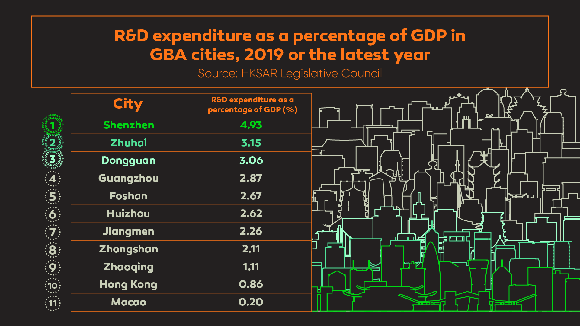 According to statistics from the Hong Kong SAR Legislative Council, Hong Kong lags behind almost all other cities in the GBA in regard to research and development (R&D) in local economies.