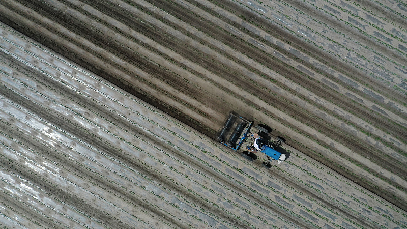 A cotton farmer carries out soil sealing operations in a cotton field in northwest China's Xinjiang Uygur Autonomous Region, May 11, 2022. /CFP