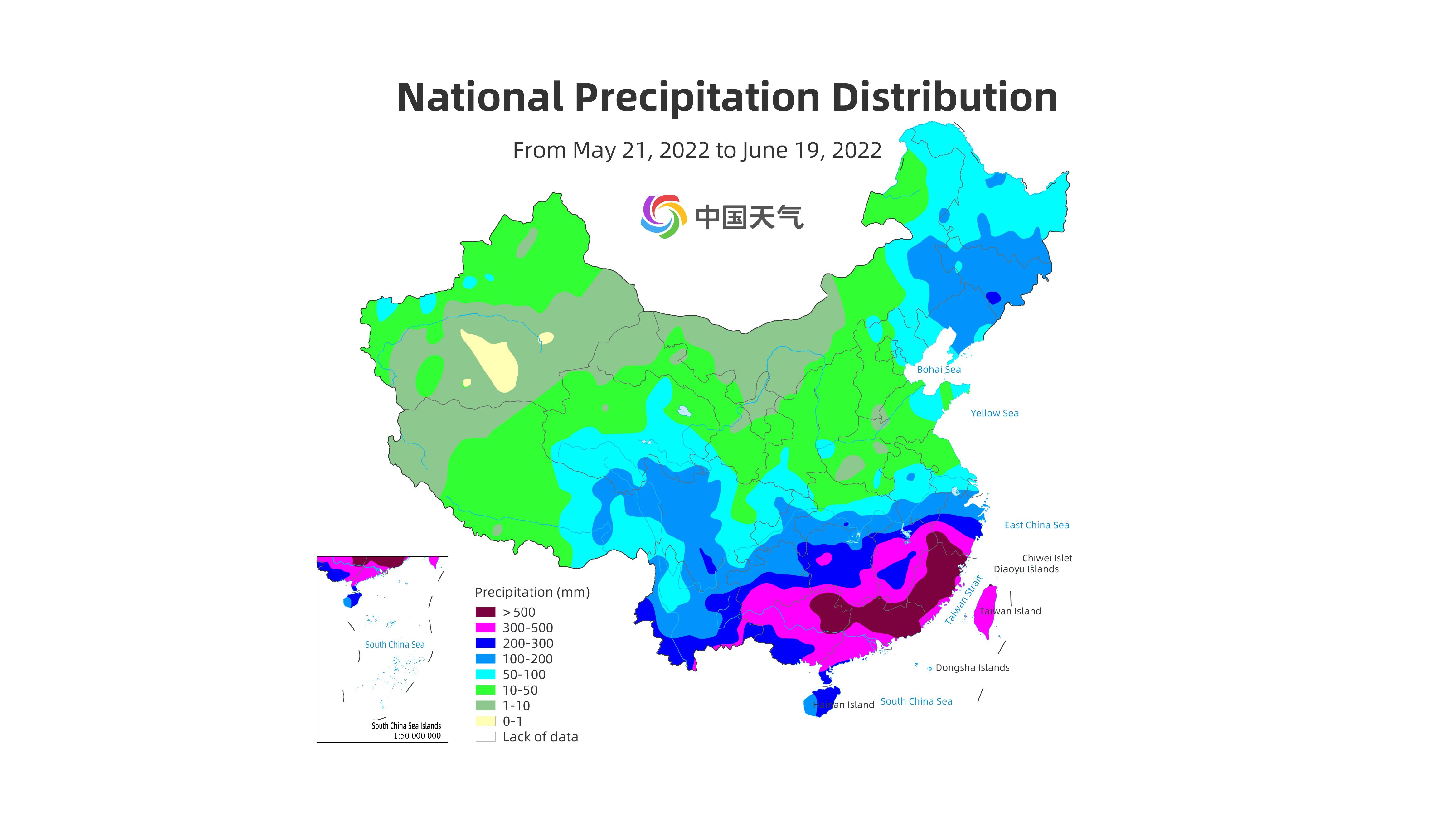 Map of China's national precipitation distribution from May 21 to June 19. /Weather China
