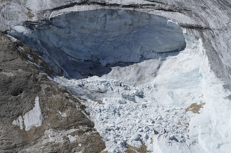 A view taken from a rescue helicopter of the Punta Rocca glacier near Canazei, in the Italian Alps in northern Italy, July 5, 2022. /CFP