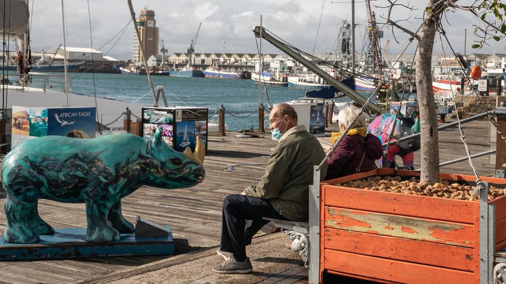 Two elderly persons wearing face masks sit on the chair at the tourist attraction V&A Waterfront in Cape Town, South Africa, June 30, 2021. /Xinhua