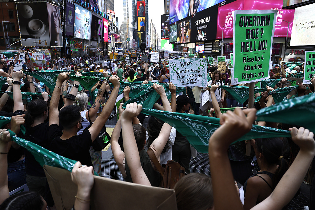 People hold up green scarves during a demonstration against the Supreme Court in Times Square on July 4, 2022 in New York City. /CFP