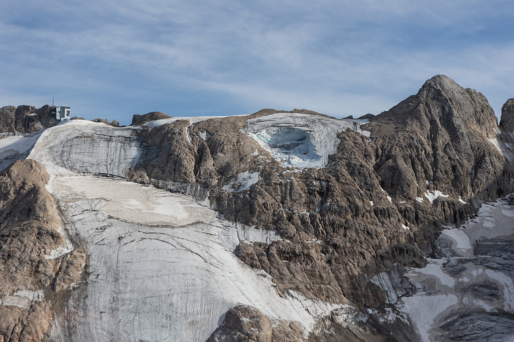 The crater left by the serac, 80 meters high, 200 meters wide and 60 meters deep, which on July 3, 2022, detached itself from the Marmolada glacier, overwhelming dozens of people in Trentino Alto Adige, Italy, July 4, 2022. /CFP