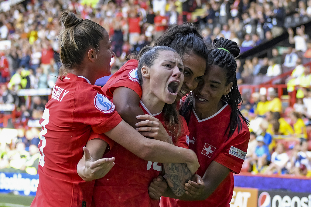 Switzerland players react after scoring the first goal during their Women's Euro clash with Sweden at Bramall Lane Stadium in Sheffield, England, July 13 2022. /CFP