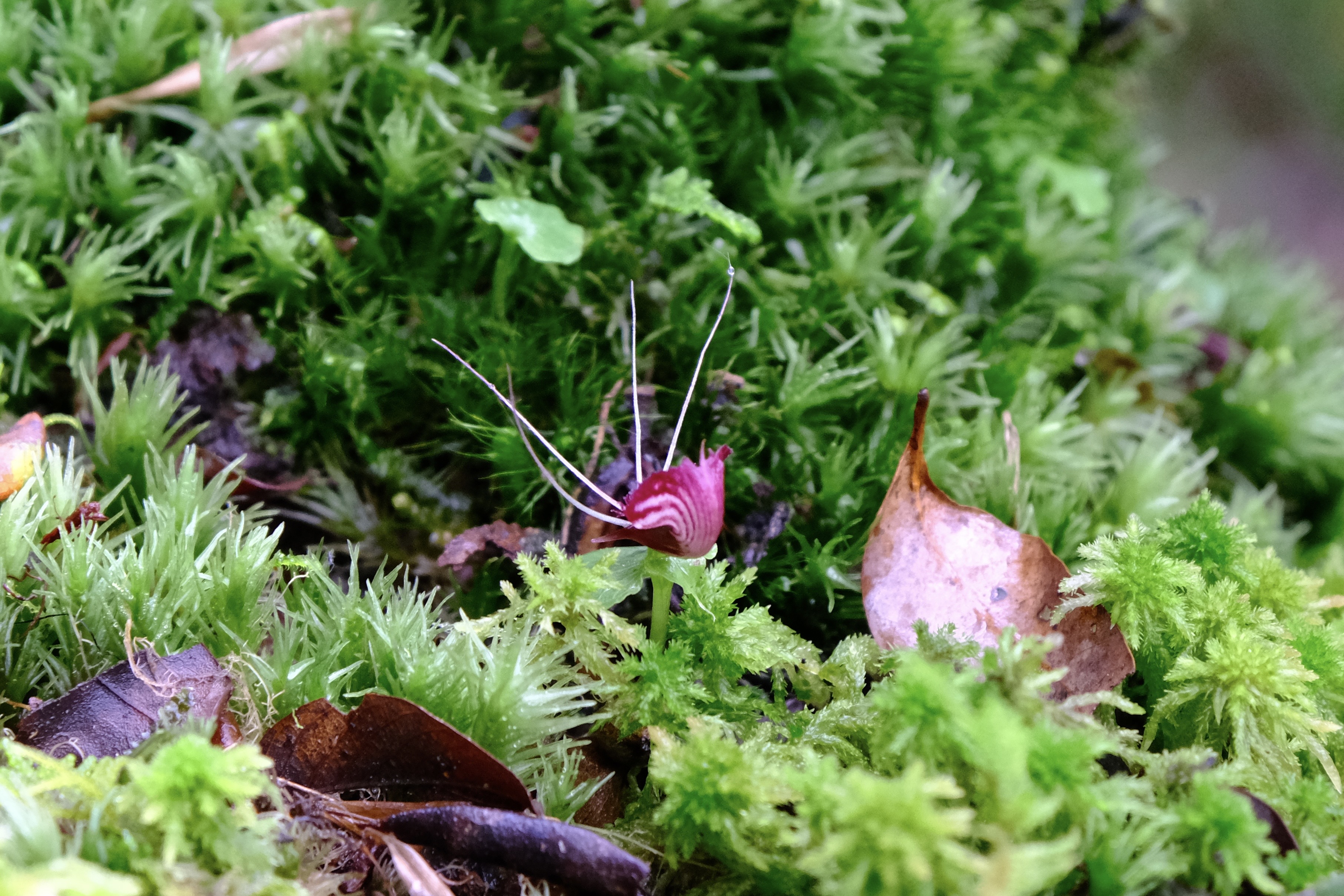 Genus Corybas is a ground herb that only has a single leaf and one flower, with only a few centimeters in height. They usually grow on moss or dead wood.