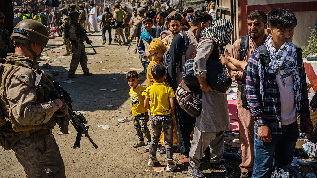 American soldiers watch over Afghan refugees waiting in line to be processed for an exit flight out of Kabul, Afghanistan, August 25, 2021. /VCG