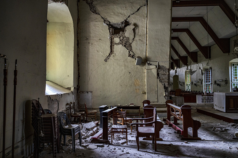 Rubble is seen inside the St. Catherine of Alexandria church following a magnitude 7.0 earthquake, in Tayum, Abra province, Philippines, July 28, 2022. /CFP
