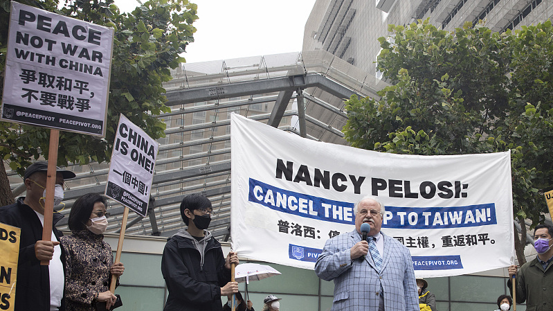 Activists from Pivot to Peace, ANSWER Coalition, CODEPINK, Veterans for Peace and leaders of the Chinese community in San Francisco hold a demonstration in front of U.S. House Speaker Nancy Pelosi's office at the San Francisco Federal Building on August 1, 2022. /CFP