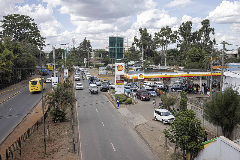 Automobiles block a lane of a highway as drivers queue for fuel at a Shell plc gas station in Nairobi, Kenya, April 13, 2022. /CFP
