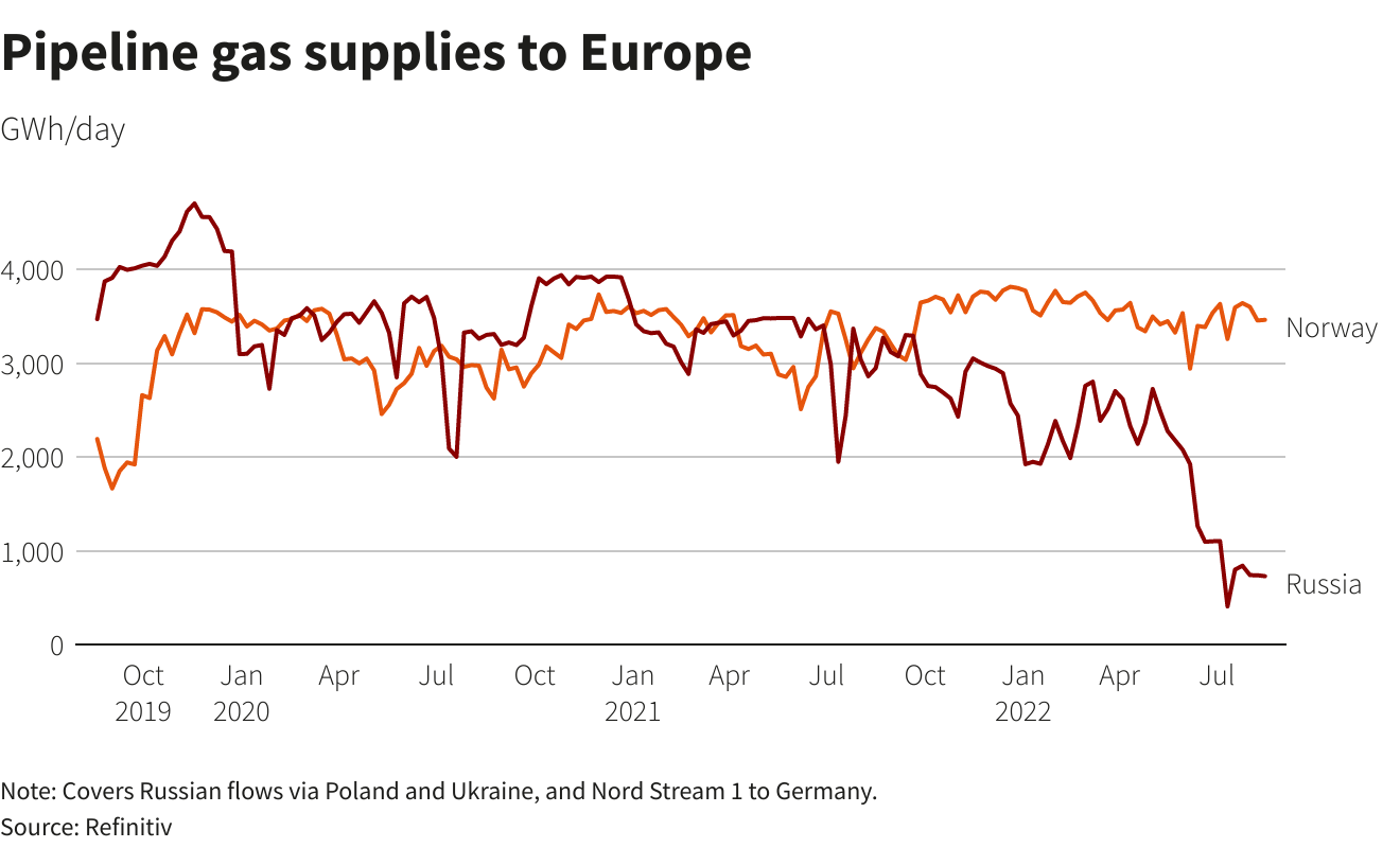 The Nordic country is now Europe's biggest supplier of gas, according to Refinitiv Eikon data, overtaking Russia, which has cut back on its gas deliveries.