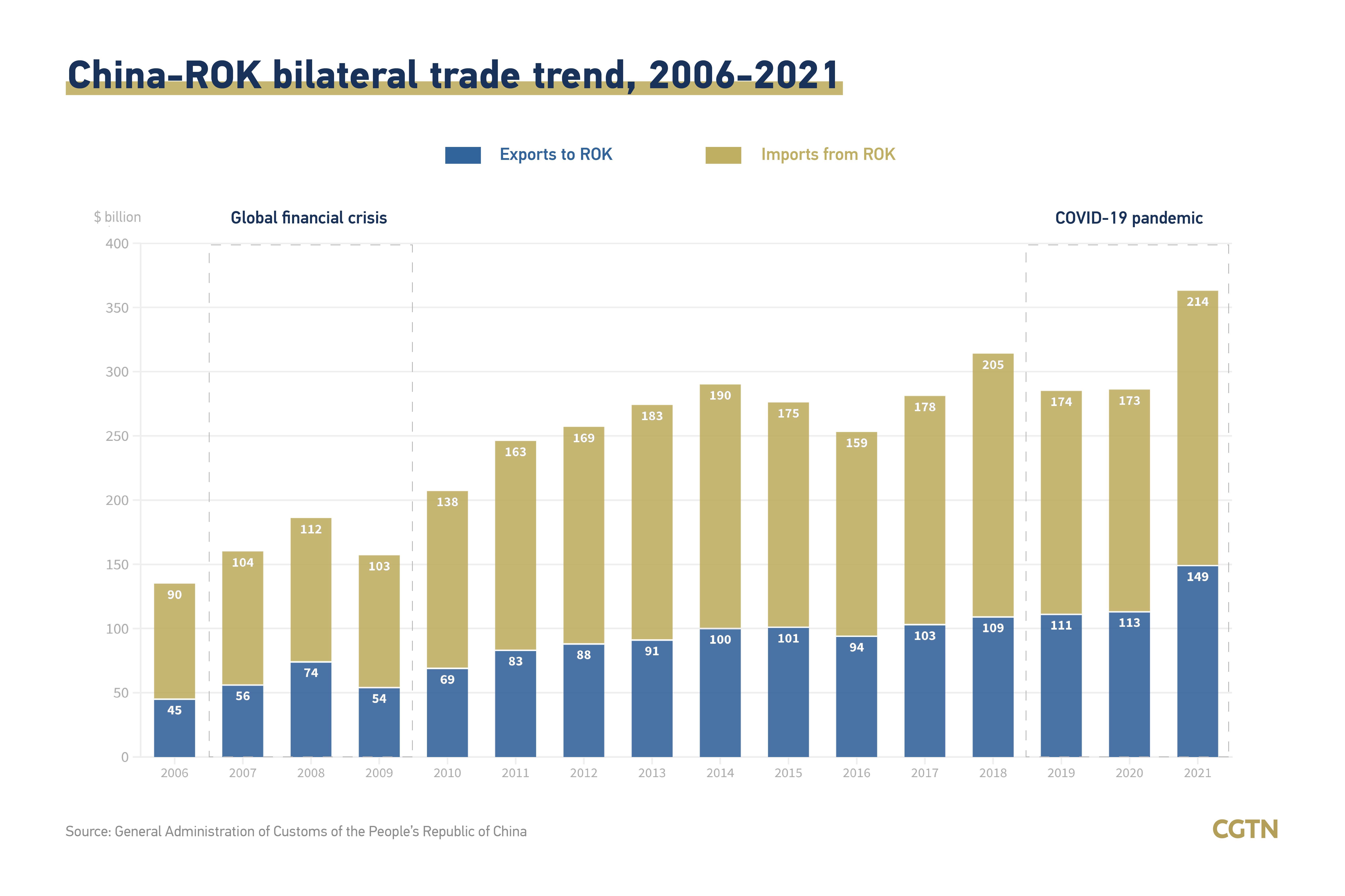 China has become South Korea's largest trading partner, while South Korea is China's third-largest trading partner. The cumulative two-way investment between the two countries over the three decades has exceeded $100 billion, according to the Chinese Ministry of Commerce.