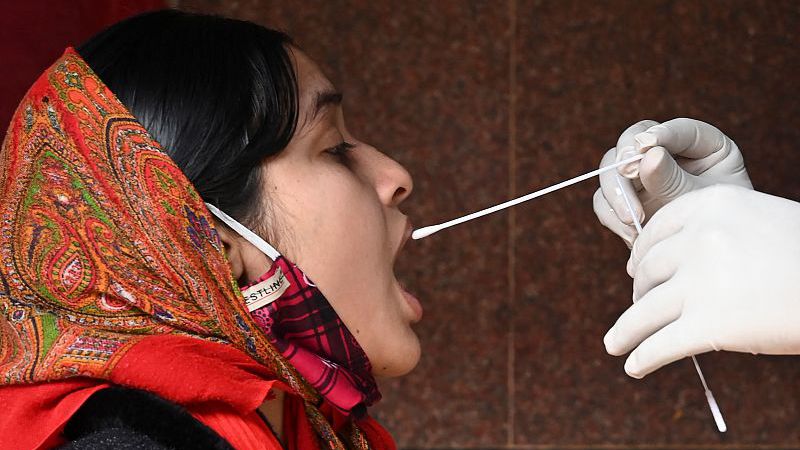 A health worker collects a swab sample from a woman to test for COVID-19 at a government hospital in Kolkata, India, January 18, 2022. /CFP