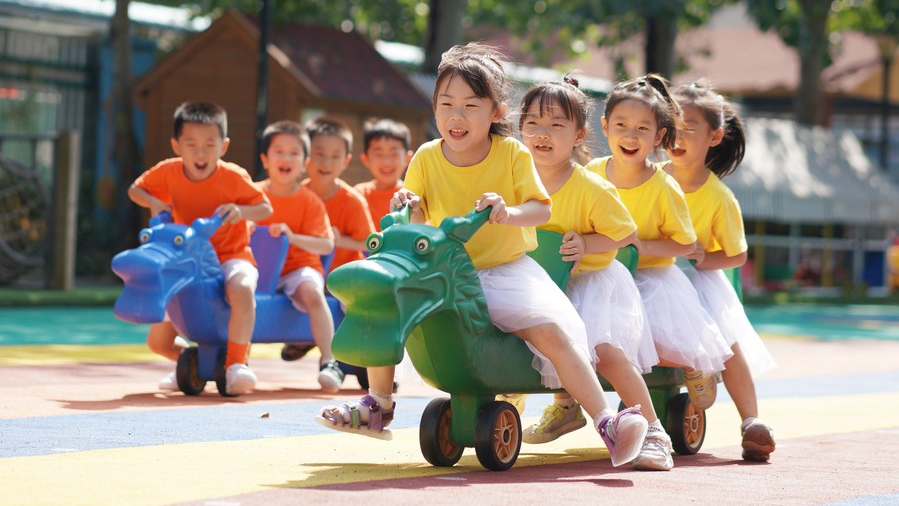 Children take part in a racing game at a kindergarten in Neiqiu County of Xingtai, north China's Hebei Province, June 10, 2021. /Xinhua