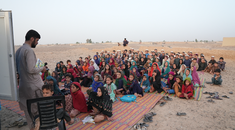 Without any classrooms, desks or chairs, children sit on the ground to attend the Pen Path mobile school. Volunteer teachers arrive at the school on tricycles, which are equipped with electronic screens and a mini library to bring basic education to some 120 children living in a remote village in Kandahar's Spin Boldak district. Here in this makeshift school, the children study Pashto, English and mathematics among other subjects.