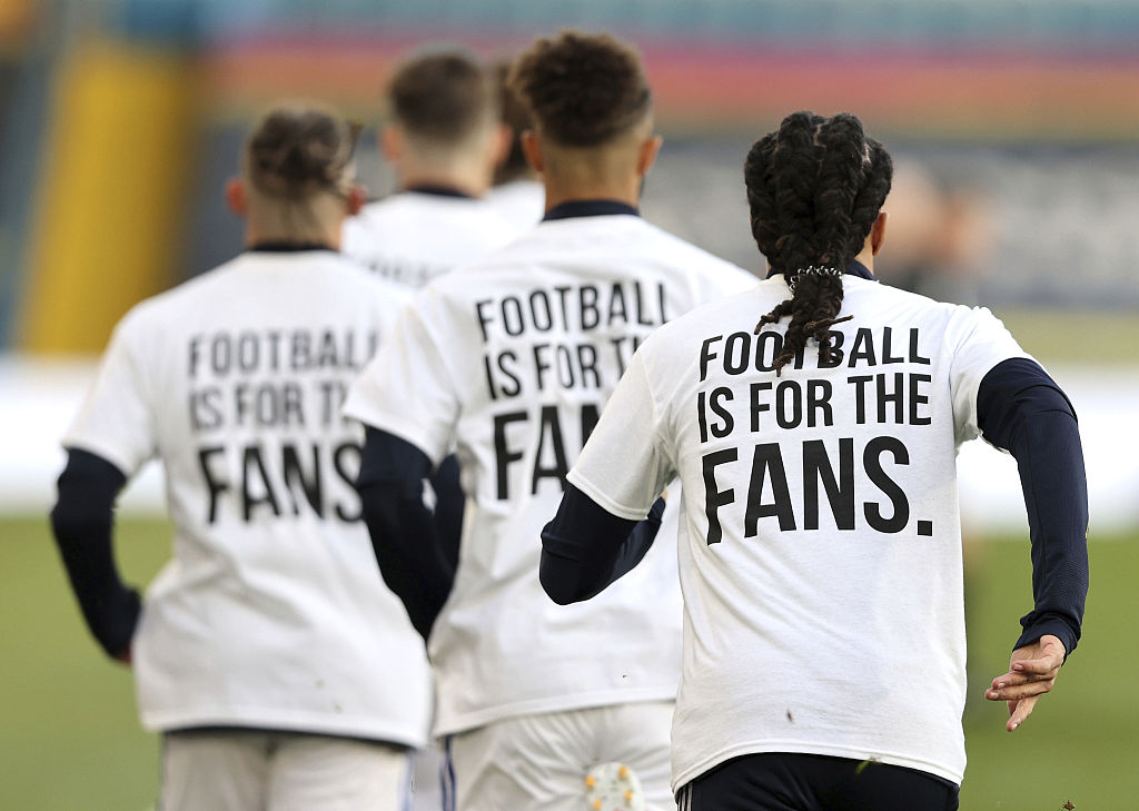 Leeds United players wear T-shirts with the logo 'Football Is For The Fans' to protest against the European Super League as they warm-up at the Elland Road stadium in Leeds, England, April 19, 2021. /CFP