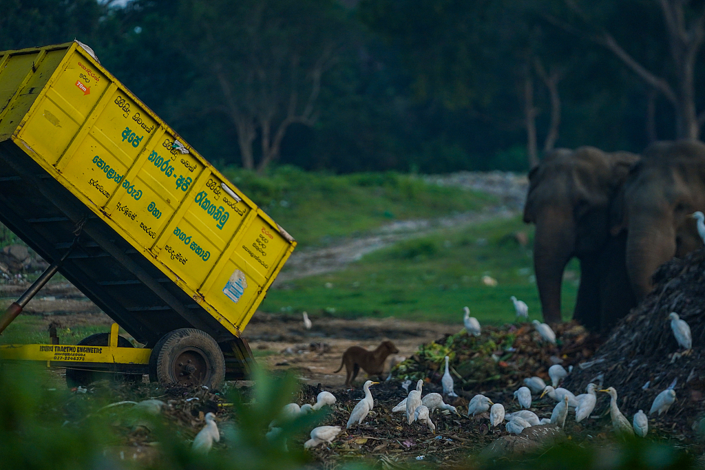 Elephants can be seen eating rubbish in a garbage dump in the Kaduruwela area of Polonnaruwa district, 224 kilometers from Colombo city. The skeletal remains of an elephant that died from eating polyethylene was found nearby. Sri Lanka is the country with the highest number of elephant deaths in the world. February 13, 2023 /CFP