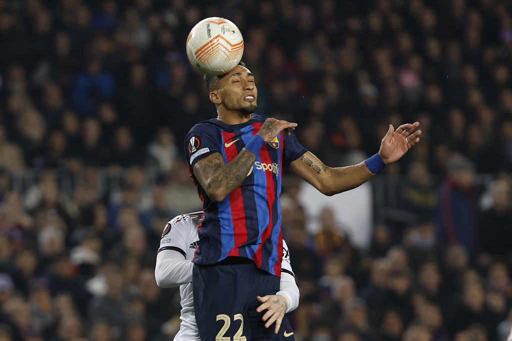 Barcelona's Raphinha heads the ball during their Europa League clash with Manchester United at Camp Nou in Barcelona, Spain, February 16, 2023. /CFP